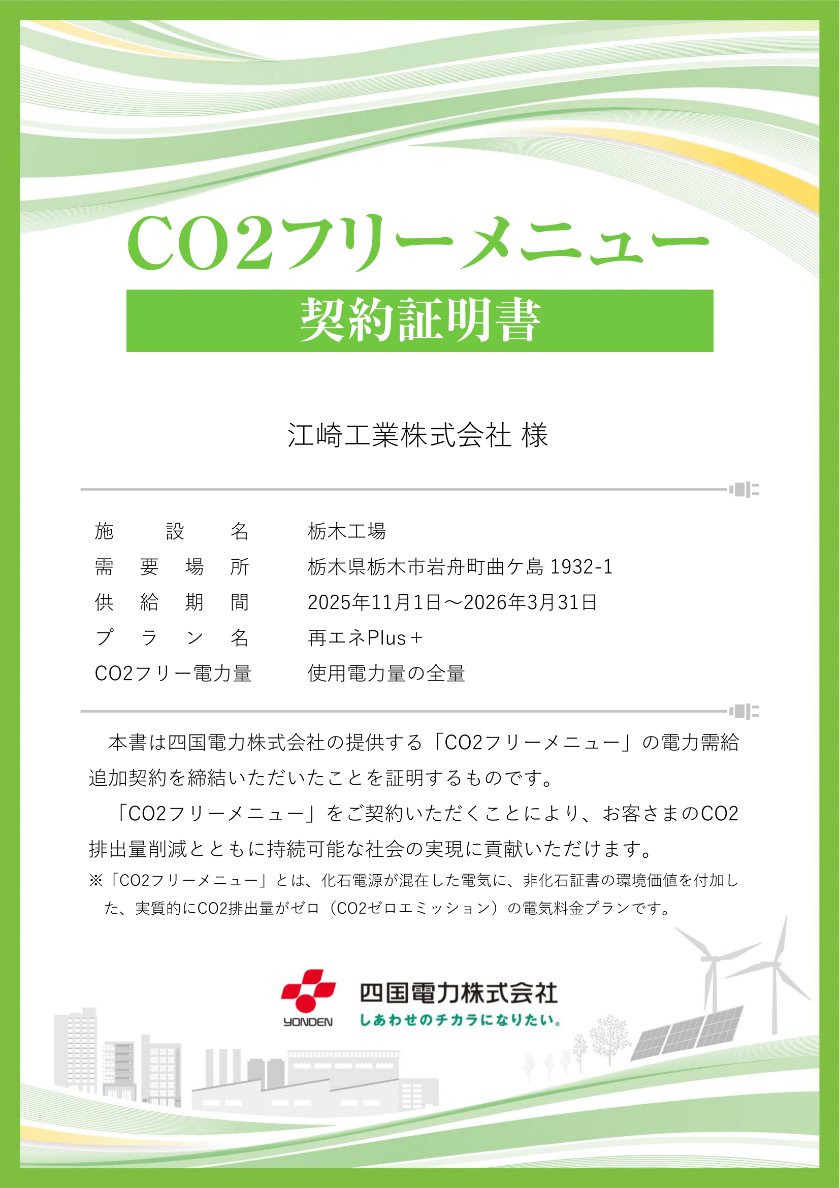 栃木工場にて2022年11月より実質CO2排出量ゼロの電力へ切替ました。